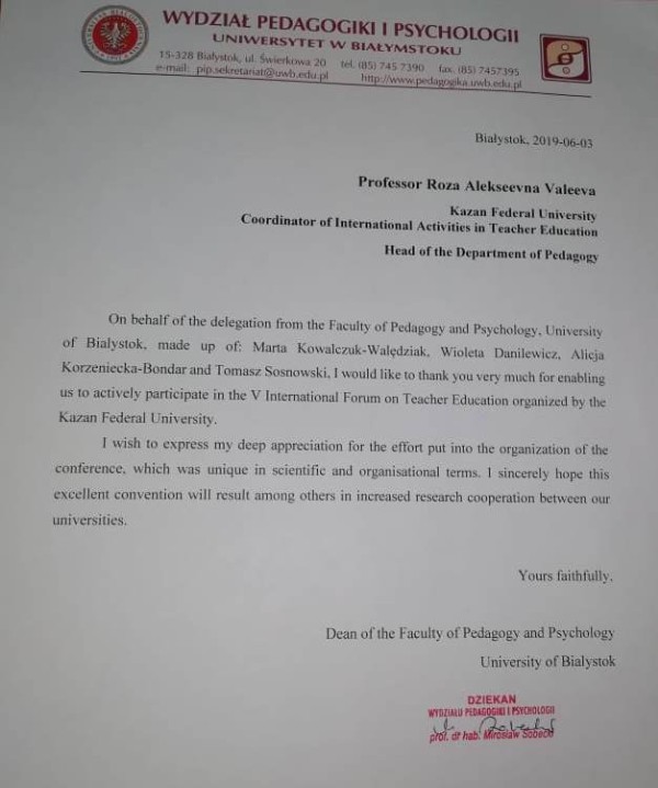 В адрес руководства Казанского университета и организаторов V Международного форума по педагогическому образованию продолжают поступать благодарственные письма и отзывы о прошедшем в мае крупнейшем на постсоветском пространстве форуме по педагогическому образованию.